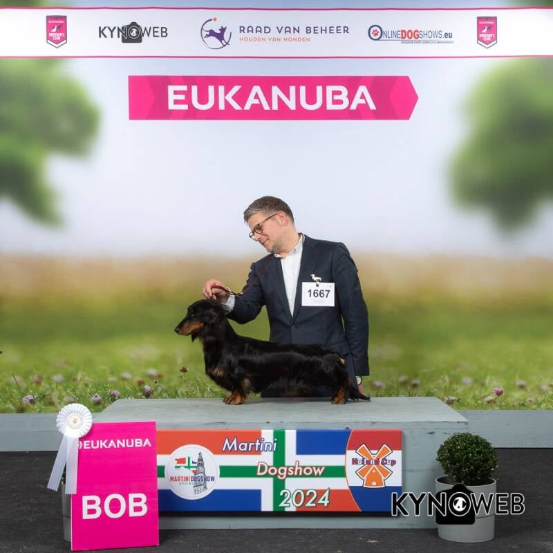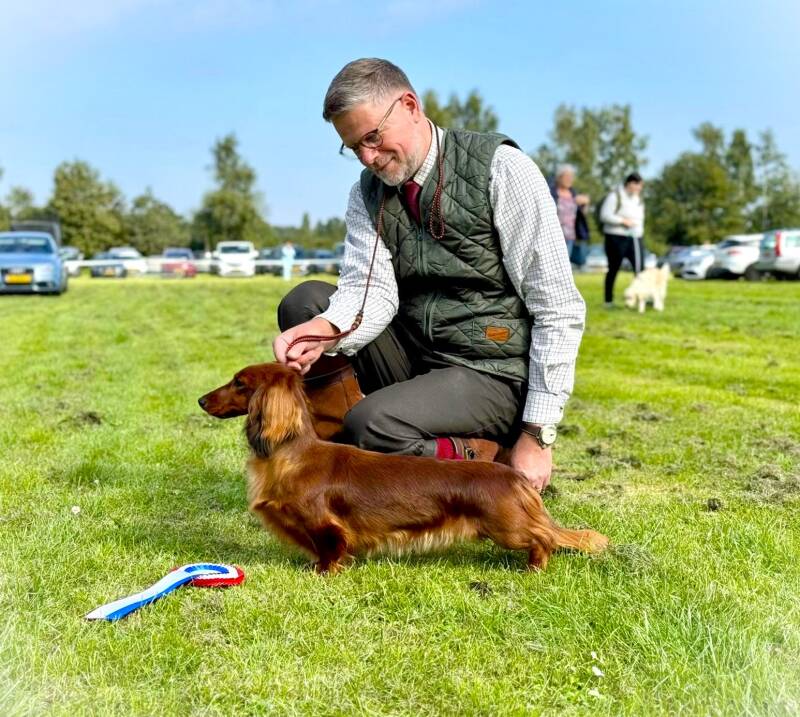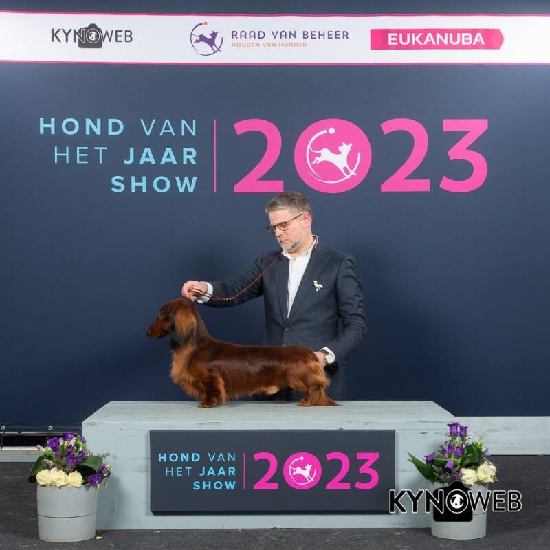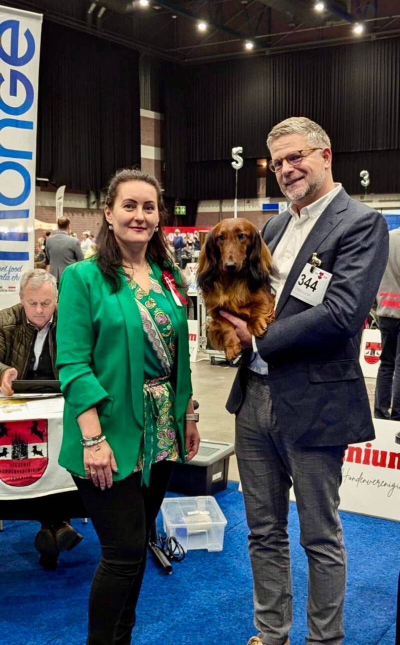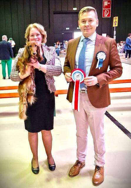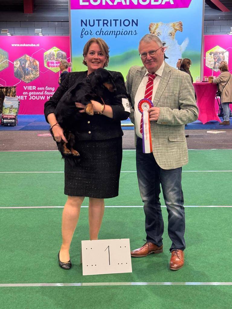 A great day at the Dutch Dachshund specialty! Ch. Voila vd Tongelaar Lu. Ch. CW'24 CW'23 BJC'23 WUT-J'23 SJC'23 CIB-J'23 LJC'23 NJK'23 JW'23 W'23 won BEST OF BREED again like she did last year! So another title to her long list of wins!