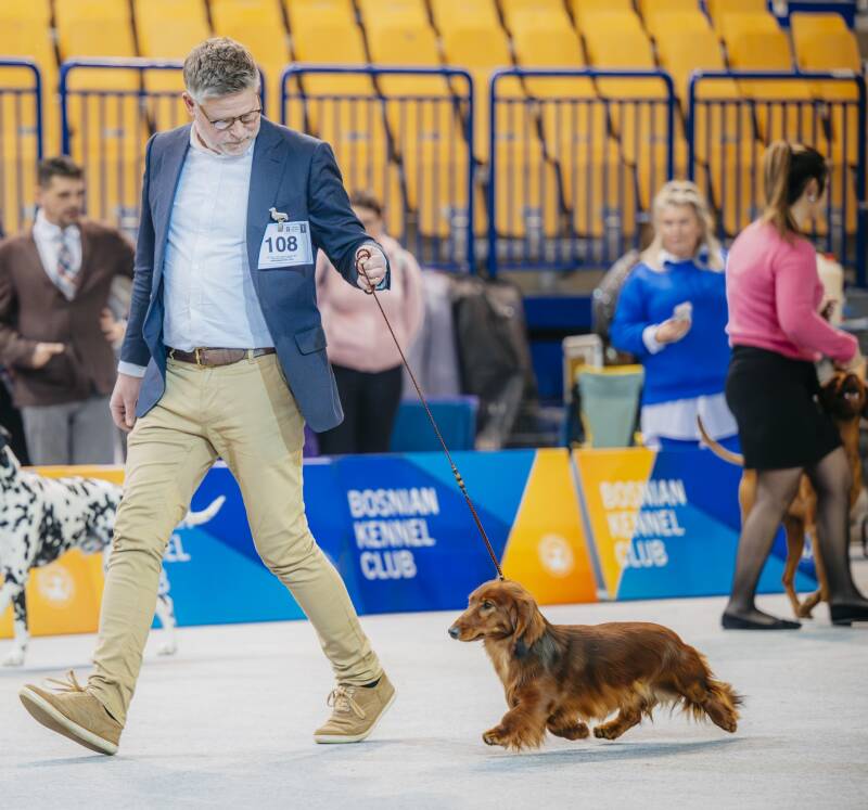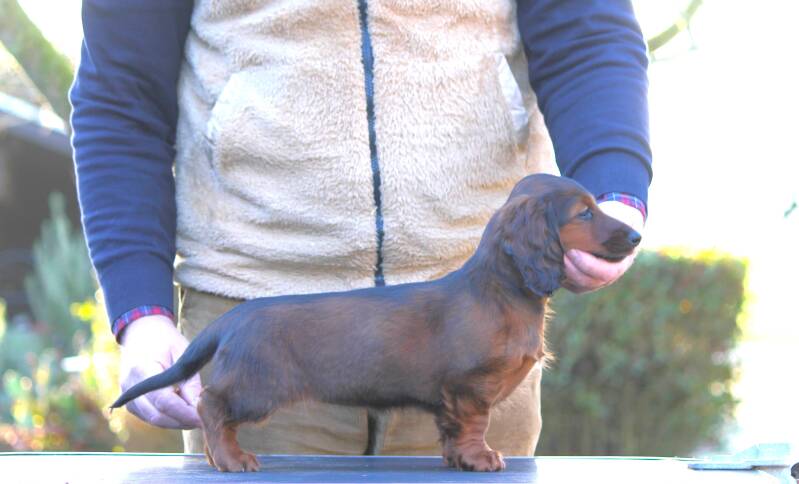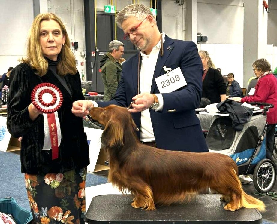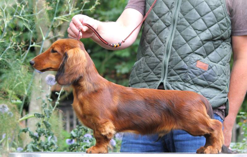 I showed Hillberry Pole Position SL, aka Max, in junior class at the Southern Dachshund Association Championship show in Bracknell, UK. 28 Standard longhairs entered.