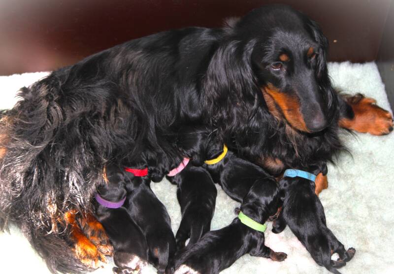 Multi Ch. Huntaks Revolution gave birth to 6 healthy chunky Black and Tan puppies! 3 boys and 3 girls! We are quite exited about this litter as it is our first B&T litter!